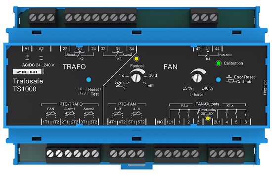 Trafosafe TS1000 используется в сухих трансформаторах с принудительным охлаждением. Он контролирует температуру трансформатора с помощью 3 цепей PTC-термисторов, регулирует охлаждение (до 6 вентиляторов по 4 А каждый) в зависимости от нагрузки, сигнализирует о превышении температуры предупреждения и отключает трансформатор при дальнейшем повышении температуры. При использовании датчиков типа Pt100 для мониторинга трансформатора, TS1000 функционирует как простой контроллер вентилятора.