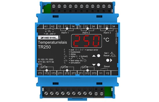 TR250 одновременно контролирует до 3 датчиков до 3 предельных значений. Возможны подключения и оценка различных датчиков Pt100, Pt1000, KTY83/84 или PTC-термисторов.
