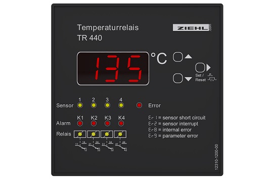 TR440 контролирует до 4 датчиков (Pt100). Например, три обмотки контролируются, а четвертый датчик контролирует сердечник. Используются 4 реле (перекидные контакты) для предварительного предупреждения, отключения трансформатора и/или управления вентилятором. Также возможно управление температурой окружающей среды в помещении установки. Возможна интеграция в сеть через интерфейс RS485, протокол MODBUS RTU.